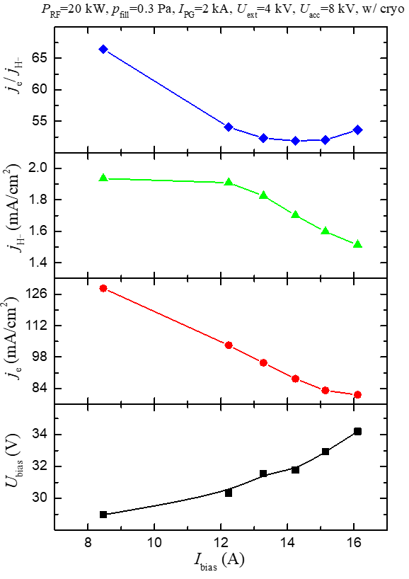 2022年应用电磁工程研究所陈德智教授团队继续开展HUST射频负离子源的调试和优化工作。主要取得的成果有:1.射频激励器及阻抗匹配的优化。射频传输效率(等离子体吸收功率:射频传输功率)是目前国际上限制NBI离子源高功率稳定运行的关键。团队通过自研的自动阻抗匹配系统,大幅降低了射频反射功率占比,优化了射频激励器的运行工况,为大功率高密度等离子体的稳定持续激发提供重要支撑;在此基础上,团队通过等离子体仿真计算、激励器结构优化及电参数测量方法改进等手段,实现了HUST射频负离子源激励器在8.4kW时射频传输效率达到76%,较之国外同类型装置在该条件下的效率提升约27%。2.在大功率等离子体的基础上,团队继续开展了负离子束引出实验(无铯条件),通过过滤磁场、偏置电压、束流光学等参数的综合调试,实现了在20kW射频功率条件下,引出束流能量12keV,束流脉冲时长8s,引出电子离子比约为50,引出负离子密度为1.91mA/cm2,该密度值达到了国际同类型装置的先进水平。该实验也为团队下一步注铯负离子束的引出奠定了基础。