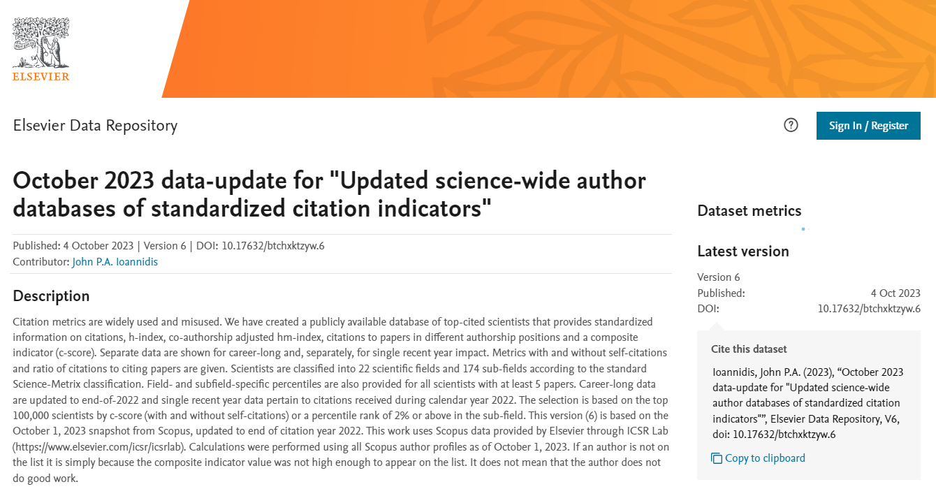 近日,爱思唯尔(Elsevier)与美国斯坦福大学(Stanford University)发布了“2023年度全球前2%顶尖科学家榜单”(World’s Top 2% Scientists 2023)。榜单分为“终身科学影响力榜单”——关注整个学术生涯迄今的影响力,和“年度科学影响力榜单”——聚焦本年度(2023年)的学术成就。