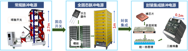 在高功率电子系统集成封装方面,提出了三维堆叠封装结构可靠性评估方法,建立了考虑电-磁-热-力多物理场耦合影响的半导体功率芯片能量-信息流模型,明晰了瞬态强场作用下三维堆叠封装结构的劣化失效机理与微观表征的演化过程,并在此基础上提出了基于异质异构三维堆叠封装集成技术的新型特种电源,将功率半导体芯片及其驱动电路直接互联集成,解决了紧凑体积与高绝缘强度协同优化难题,实现了功能结构一体化设计,突破了现有工业器件水平限制,不仅使电源体积减少到原来的五分之一,而且将杂散电感减少到纳亨级,输出脉冲上升时间缩短50%。
