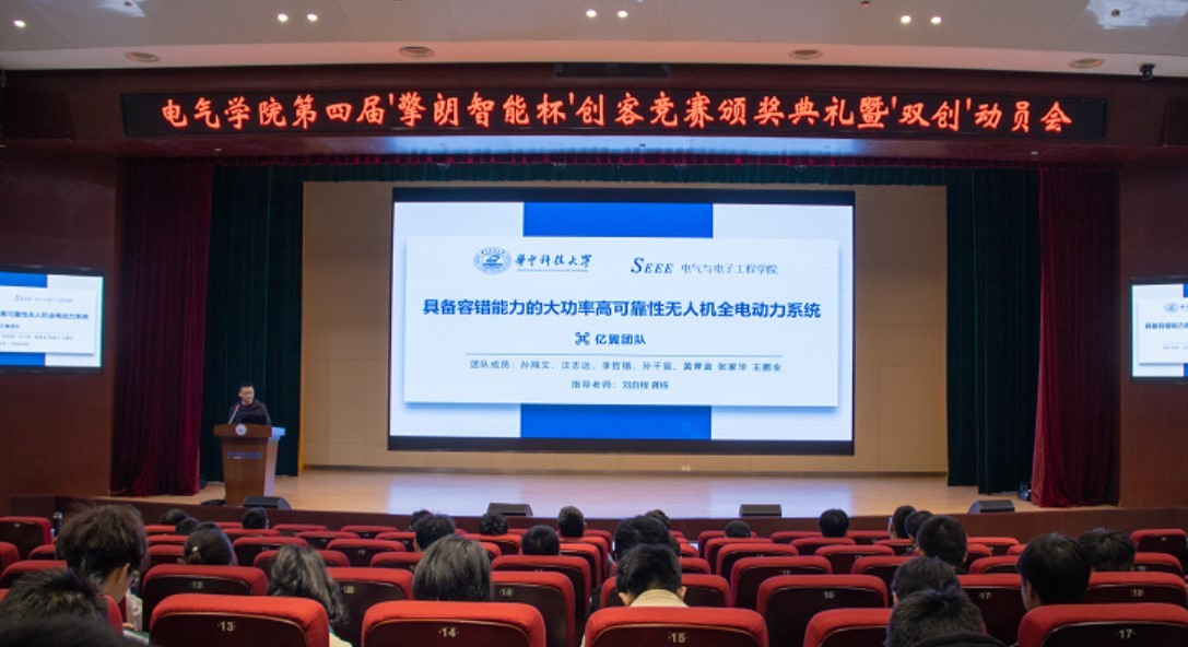 颁奖典礼之后进行了“双创”动员。来自NT动漫 的四支优秀“挑战杯”队伍,依次上台向同学们展示了他们的项目。由刘自程和蒋栋教授指导的“亿翼团队”向大家展示了“具备容错能力的大功率高可靠性无人机全电动力系统”。该项目针对现有无人机动力系统存在的容错能力不足,工作性能低等问题提出了自己的解决方案。他们采用多相电机结构,双层绕组及开绕组结构等设计,从多方面提升了无人机动力系统的性能。