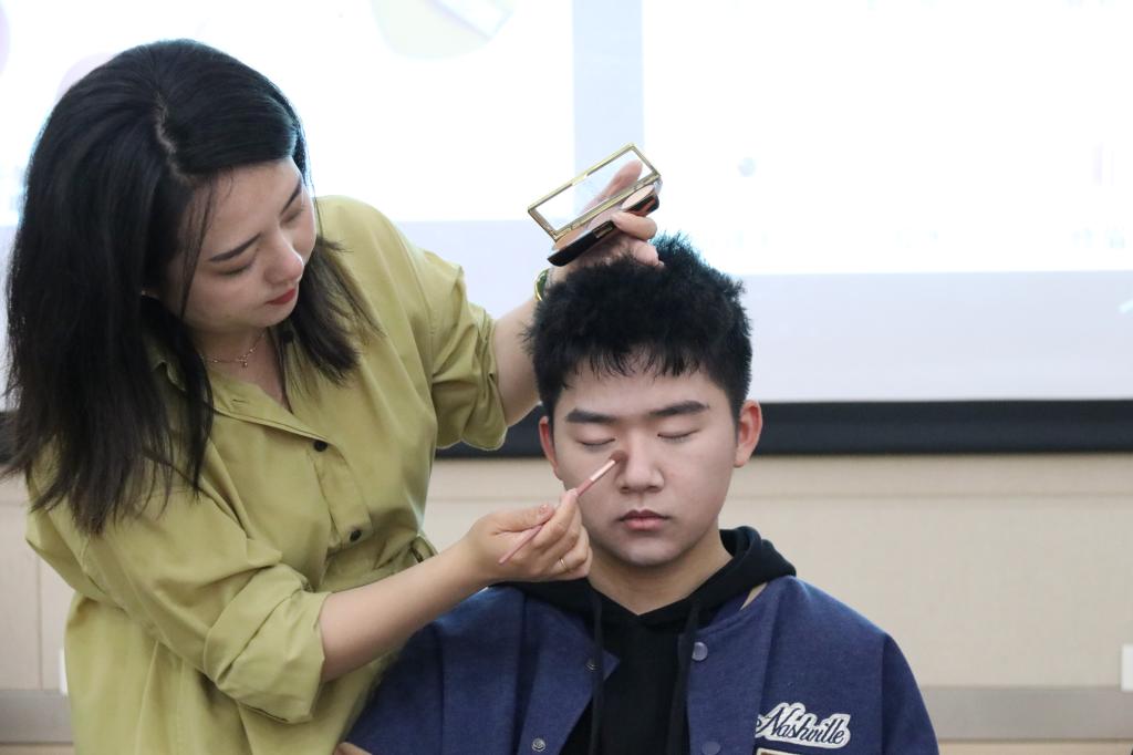 在本次课程的重头戏美妆的基本操作上,葛老师细致地从男生和女生两种角度出发进行了讲解。考虑到很多男同学对美妆的基础知识了解不够,葛老师先带同学们了解了美妆的基础工具以及典型的彩妆用品。接着,葛老师从三庭五眼的划分来教同学们辨认自己的脸型,并找了两位男同学当模特,教授男生化妆的具体步骤。很多男同学在下面也积极参与,对着镜子用老师发的彩妆产品在自己脸上或者同学脸上实践。在女生妆容上,葛老师找了几位女同学作模特,从修眉、画眉、妆前乳的选择、修容的步骤、眼影的颜色选取与画法等方面细致地传授女生妆容的要点。