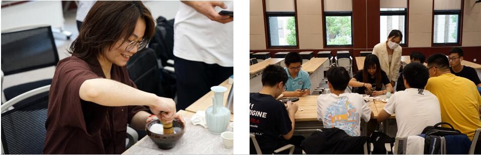 下午的另一个重头戏是宋代点茶。点茶的步骤与一般泡茶大为不同,其难点在于需要用茶筅不断在盏中回环搅动,称为“击拂”,直至茶汤中出现乳白色的泡沫。这一步骤需要同学用正确的手法用力搅动,难度较大,但仍有同学成功点出一碗上好茶汤。
