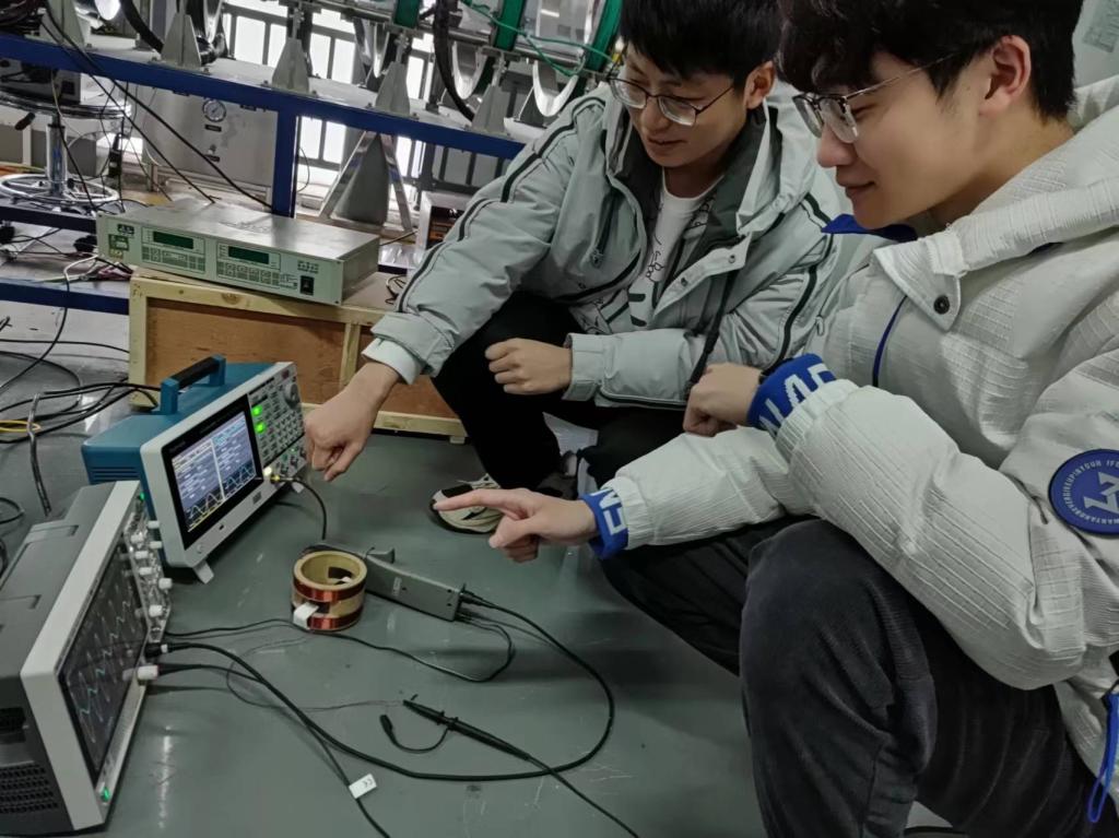 强磁场专业的研究生们在电气大楼A112进行开学第一场实验测试——磁场探针校准测试。实验室里闪烁的指示灯、精细的刻度和调节旋钮,都是实验者们如数家珍的工具。实验台上,仪器设备在飞速地运行着,显示屏上,一道道波形,一行行数据不停滚动变化。做实验的同学们一派典型的科研者形象,他们全神贯注地观察着实验结果,谨慎而精准地检查每一个步骤,分析讨论着复杂的数据,实验室里充满了求知和探索的气息。那一个个忙碌的身影都成为了实验室里独一无二的风景。