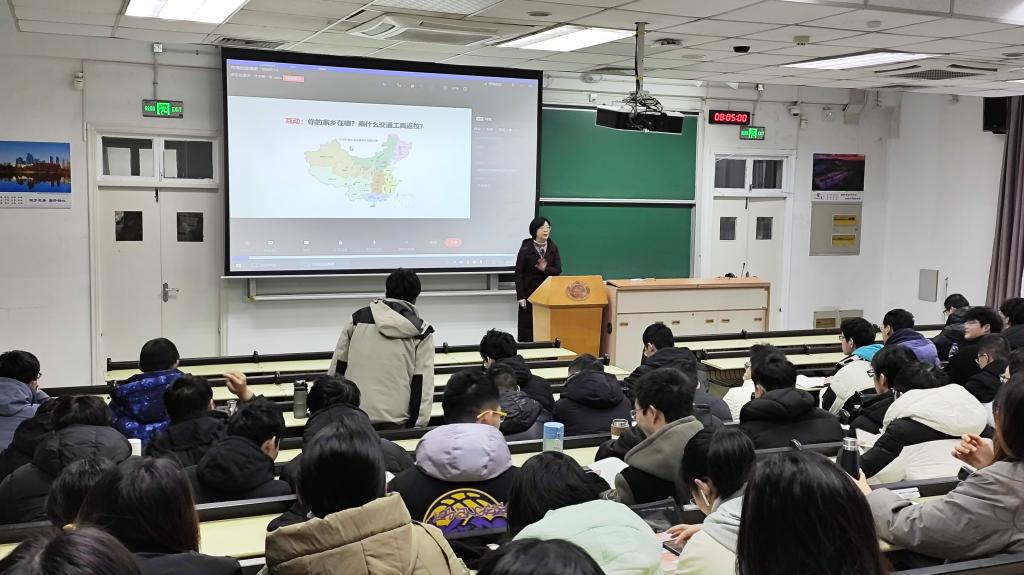新学期第一天,电气2204-2206班的同学们在西十二N111,聆听文红玉老师讲授《毛泽东思想和中国特色社会主义理论体系概论》。文老师通过“你的家乡在哪儿”“通过什么交通工具返校”的问题,引出交通工具的变迁和社会的高速发展,引发了同学们的思考和讨论。上课期间,同学们和文老师频繁互动,课堂气氛热烈。