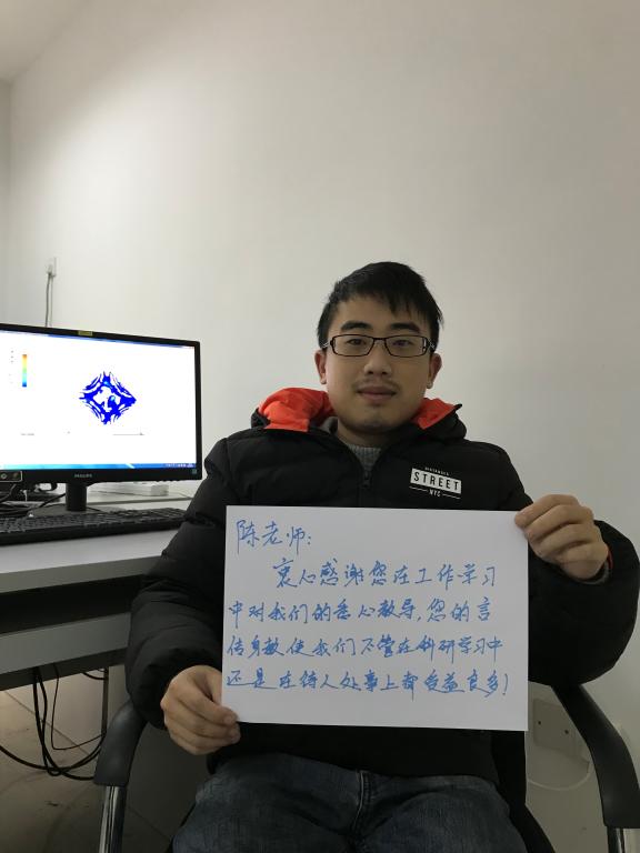 陈老师是一位令人敬重的好老师。对待学术,老师一丝不苟、严谨认真,在教育学生时始终秉持“授人以渔”的教学理念,注重培养学生自主思考和解决问题的能力。他在科研项目中的创新思维总是令人叹服,如庖丁解牛般将问题逐层剥开,始终注视到问题的本质,让我受益匪浅。希望老师能够在自己热爱的科研事业中取得更多更好的成果。