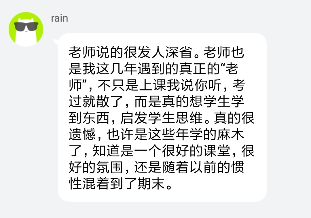 他深入浅出的授课方式,将电磁场抽象复杂的理论变得形象直观。课堂中体现的科学研究的方法,认识、分析与解决问题的思路,虽然只短短一学期,“却是我们研究生起步阶段宝贵的财富。”