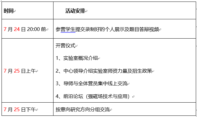 受疫情影响,本次夏令营拟采用网络会议形式举行。线上夏令营期间,广大入选的营员们将享受到一系列精彩纷呈的学术“盛宴”,感受国家脉冲强磁场科学中心及其科研实力。期间,中心领导将向营员们介绍强磁场中心概况,介绍强磁场中心师资力量与招生政策;举行学术沙龙活动,营员对各自选题作PPT展示,充分展示科学素养和科研能力。 详细活动行程安排和规定见附录一。