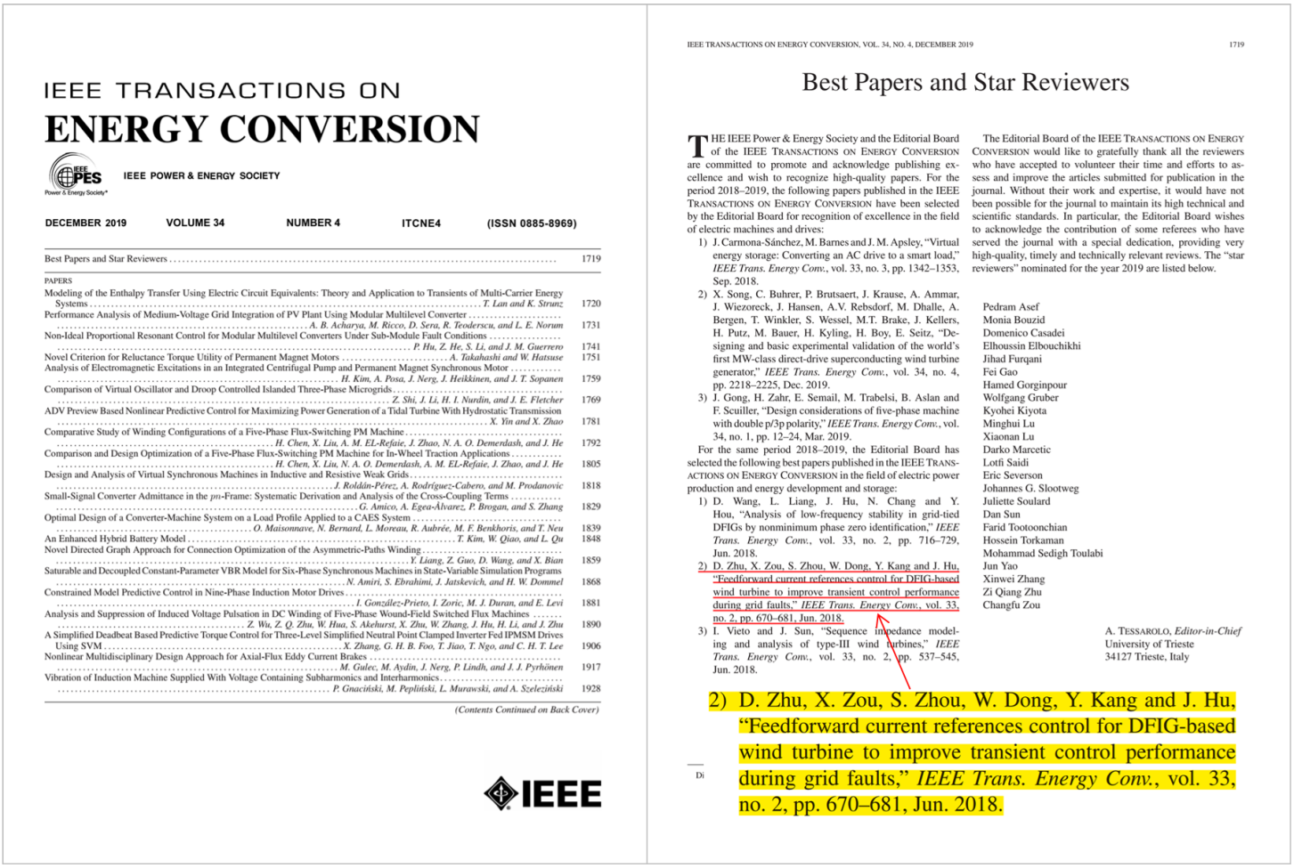 IEEE Transactions on Energy Conversion于1986年创刊,最新的影响因子为4.614,属于JCR Q1区,是电气工程学科的老牌期刊之一,业界认可度高。2018-2019年度,该期刊从发表的448篇论文中共选出6篇Best Paper。此外,NT动漫 院友香港大学侯云鹤教授与胡家兵教授合作完成的一篇论文也成功入选Best Paper行列。