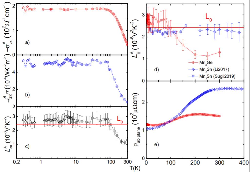 此次通过对非共线反铁磁材料Mn3Ge从室温到亚开尔文温度范围内的反常霍尔效应和反常热霍尔效应进行研究(图1),验证发现反常横向魏德曼弗兰兹定律在低温下也是成立的,但是在高温段并不符合。