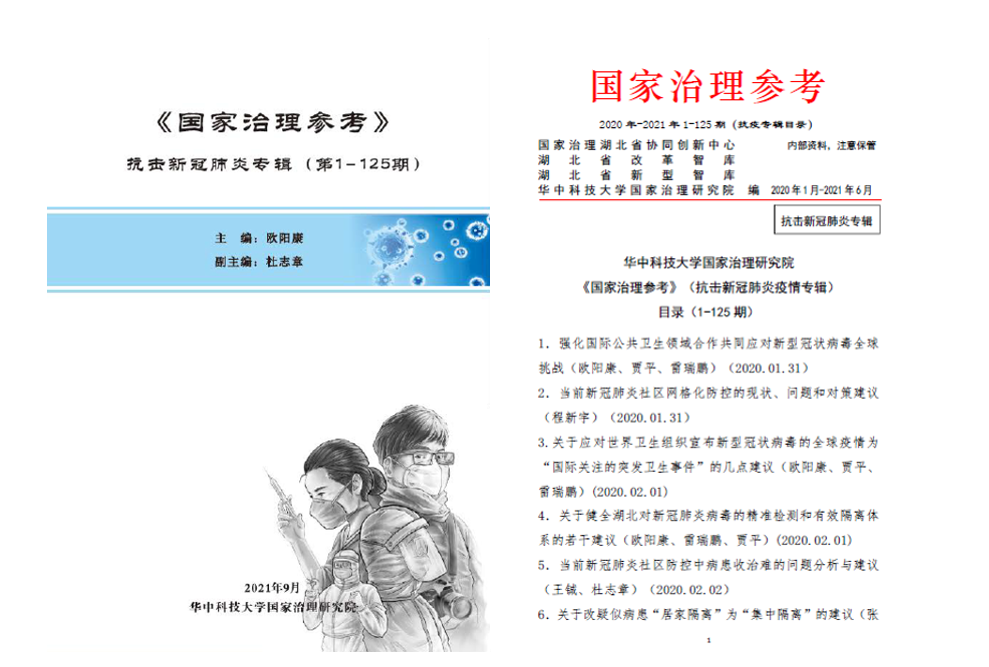 新冠肺炎疫情发生后,国家治理研究院以“智”抗“疫”,根据疫情进展和抗击疫情不同阶段的需要,先后编印了125期《国家治理参考》(抗击新冠肺炎专辑),为疫情防控做出巨大贡献。团队围绕新冠肺炎疫情,较早提出助力新冠肺炎阻击战的有效措施,分析疫情引发的各类社会风险及其应对建议,研究疫情对经济社会的影响及复工复产建议,关注疫情防控中的国际合作与国际援助及我国对策建议,帮扶重点人群和提供心理援助,反思疫情防控促进公共卫生治理现代化。