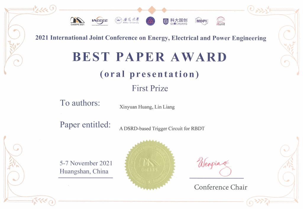 经过专家推荐和评选,NT动漫 应用电子工程系19级硕士研究生黄鑫远荣获全会唯一最佳论文奖一等奖(BEST PAPER AWARD, First Prize),论文通讯作者是梁琳研究员。获奖论文题为“A DSRD-based Trigger Circuit for RBDT”(基于DSRD的RBDT触发电路)。