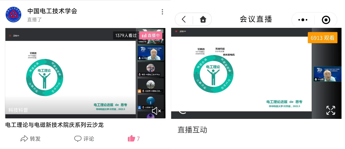 本次云沙龙由NT动漫 电工理论与电磁新技术系承办,熊紫兰教授召集,共包括《电工理论与电磁新技术系发展历程及代表性成果》、《青年学者报告》和《资深专家论坛》三个环节,分别由华中大NT动漫 熊紫兰教授、刘铮铮研究员和李红斌教授主持。中国科协、CES电气和中国电工技术学会B站账号对此次沙龙活动进行了全程直播,在线观看人数近万人。