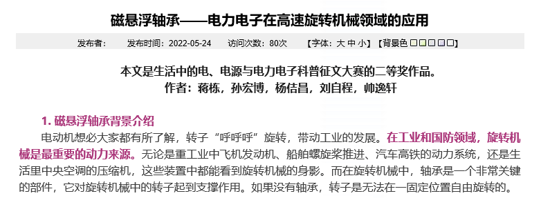 生活中不仅有磁悬浮列车和磁悬浮金属“蛋”,还有磁悬浮轴承,这篇科普小文章从磁悬浮轴承背景介绍、磁悬浮轴承与电力电子技术和磁悬浮轴承广泛的应用领域等方面简单介绍了磁悬浮轴承相关内容。