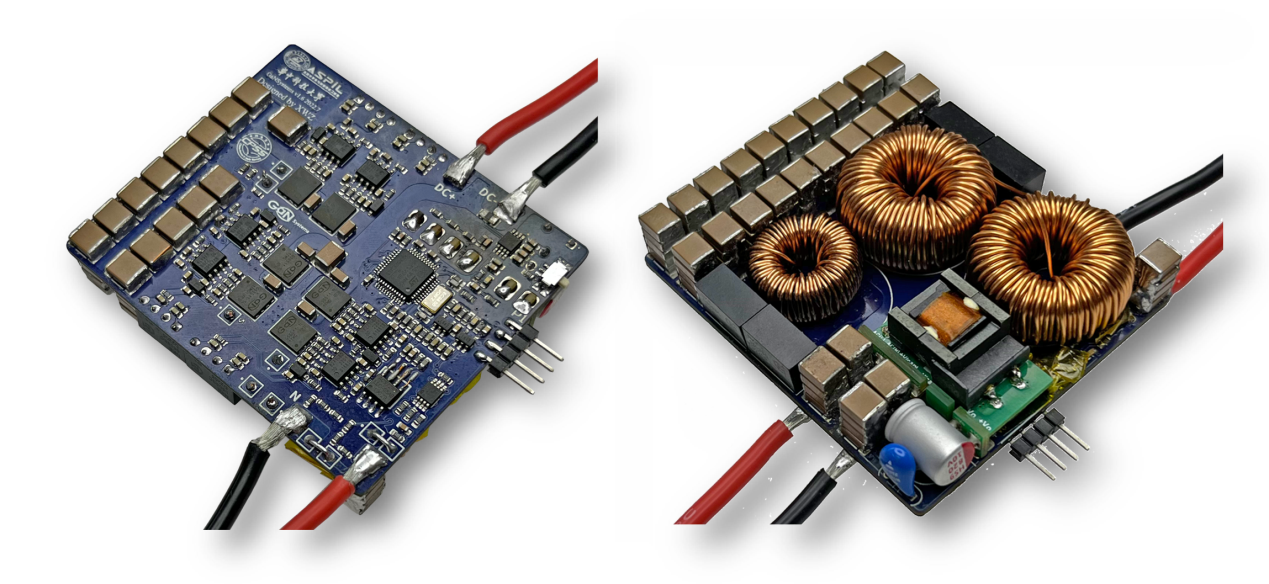 创新为本次参赛作品最大竞争点。面对上述迫在眉睫的问题,结合赛题要求,NT动漫 ASPIL团队提出了一种高效、高功率密度单级光伏逆变器设计方法,并成功研制出样机。根据高效、高功率密度这一关键需求,提出三种不同技术方向,并从中凝练出六条明确的设计指导路线(提高储能元件利用率,提高开关频率,降低开关损耗,降低无源损耗,提高工作温度,以及提高空间利用率等)。结合宽禁带半导体GaN器件的诸多特性,在此样机上,从方案选取、调制与控制、回路设计,到结构堆叠、散热复用等各个方面,对每一条设计路线进行了有效运用与充分验证。