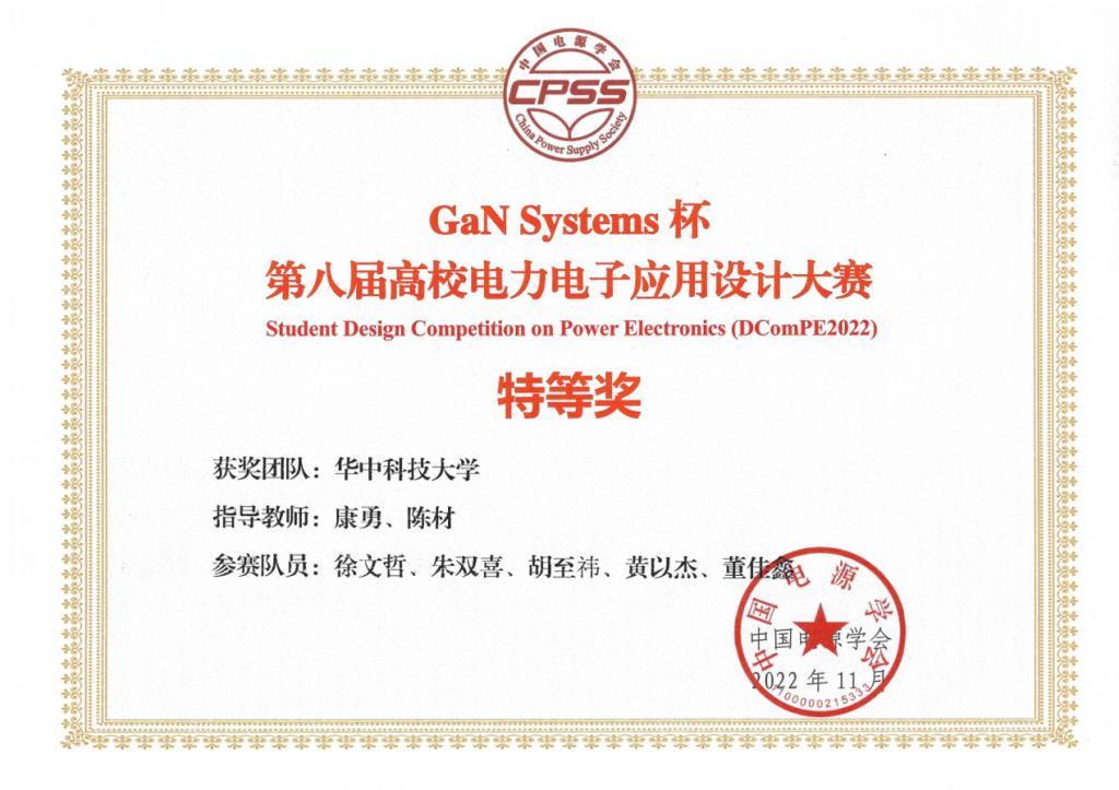 2022年11月3日至6日,“GaN Systems杯”第八届高校电力电子应用设计大赛决赛在福建省厦门市举行。本次比赛为“GaN Systems杯”的首届赛事,共有来自全国46所高校的64支队伍参赛,其中16支队伍挺进现场总决赛。经过激烈角逐,NT动漫 院康勇教授与陈材副研究员指导的ASPIL团队力压群雄,独占鳌头,斩获本届赛事唯一特等奖!参赛队员是徐文哲、朱双喜、胡至祎、黄以杰、董佳鑫。此外,其它兄弟院校有2支队伍获得一等奖,3支队伍获得二等奖,2支队伍获得三等奖。