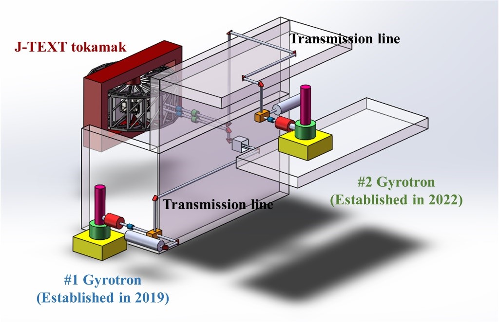 J-TEXT托卡马克的等离子体加热手段为常规欧姆加热。欧姆加热功率有限,且加热效率随着等离子体温度上升不断下降,使得装置运行区间有限,限制了装置开展先进物理实验的能力。考虑到电子回旋波具有功率沉积局域性好、耦合效率高以及发射天线可远离等离子体边界等优点,是稳态大尺寸超导聚变装置(如ITER、W7-X)及未来聚变示范反应堆优先发展的等离子体加热方法。因此,为有效提升J-TEXT装置运行区间,开展高参数特别是先进运行模式条件下的物理实验研究,聚变所于2016年底启动了ECRH系统的攻关工作,于2019年上半年顺利完成了第一套系统的研制工作,并2020年上半年正式启动新系统研制工作。