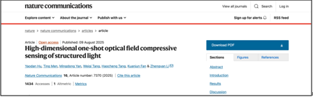近日,NT动漫 博士生胡耀丹以第一作者在国际期刊Nature Communications上发表论文“结构光场的高维单发压缩感知测量”(High-dimensional one-shot optical field compressive sensing of structured light)。该研究首次实现了对任意光场进行单次曝光,同步解析其振幅、相位、偏振和波长等全部矢量信息,助力高维单次光场压缩感知(HOOCS)研究。