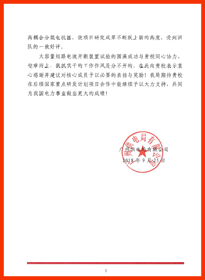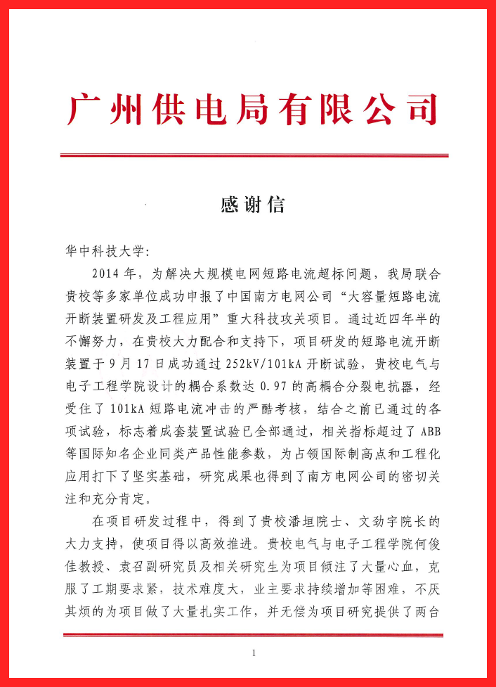 2018年9月17日,学院潘垣院士、何俊佳教授、袁召老师等在南方电网重大科研攻关项目“大容量短路电流开断装置研发及工程应用”支持下研发的220kV系统用大容量短路电流开断装置,在西安国家高压电器产品质量监督检验中心成功通过100kA级短路电流开断试验,使我国220kV系统用高压断路器的开断容量指标达到国际最高水平。