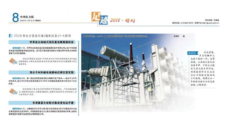《中国电力报》于2019年1月10日,刊出2018年 电力装备行业(输配设备)十大新闻。NT动漫 研制的项目入选头条新闻。