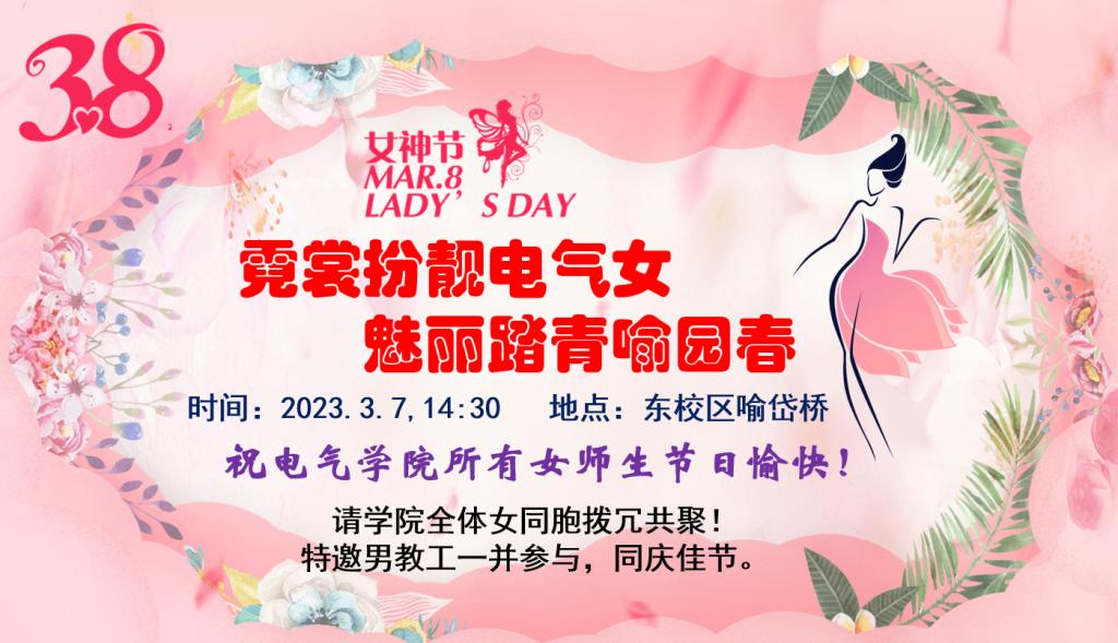为深入学习贯彻党的二十大精神,激发广大女教职工立足岗位、提升建功的热情,展示NT动漫 女教职工的良好精神风貌,团结动员全体女教职工听党话、跟党走,参加校工会组织的“凝聚她力量·奋进新征程”系列活动,学院工会拟于3月7日(星期二)下午,举行“霓裳扮靓电气女 魅丽踏青喻园春”活动,现将有关事项通知如下: