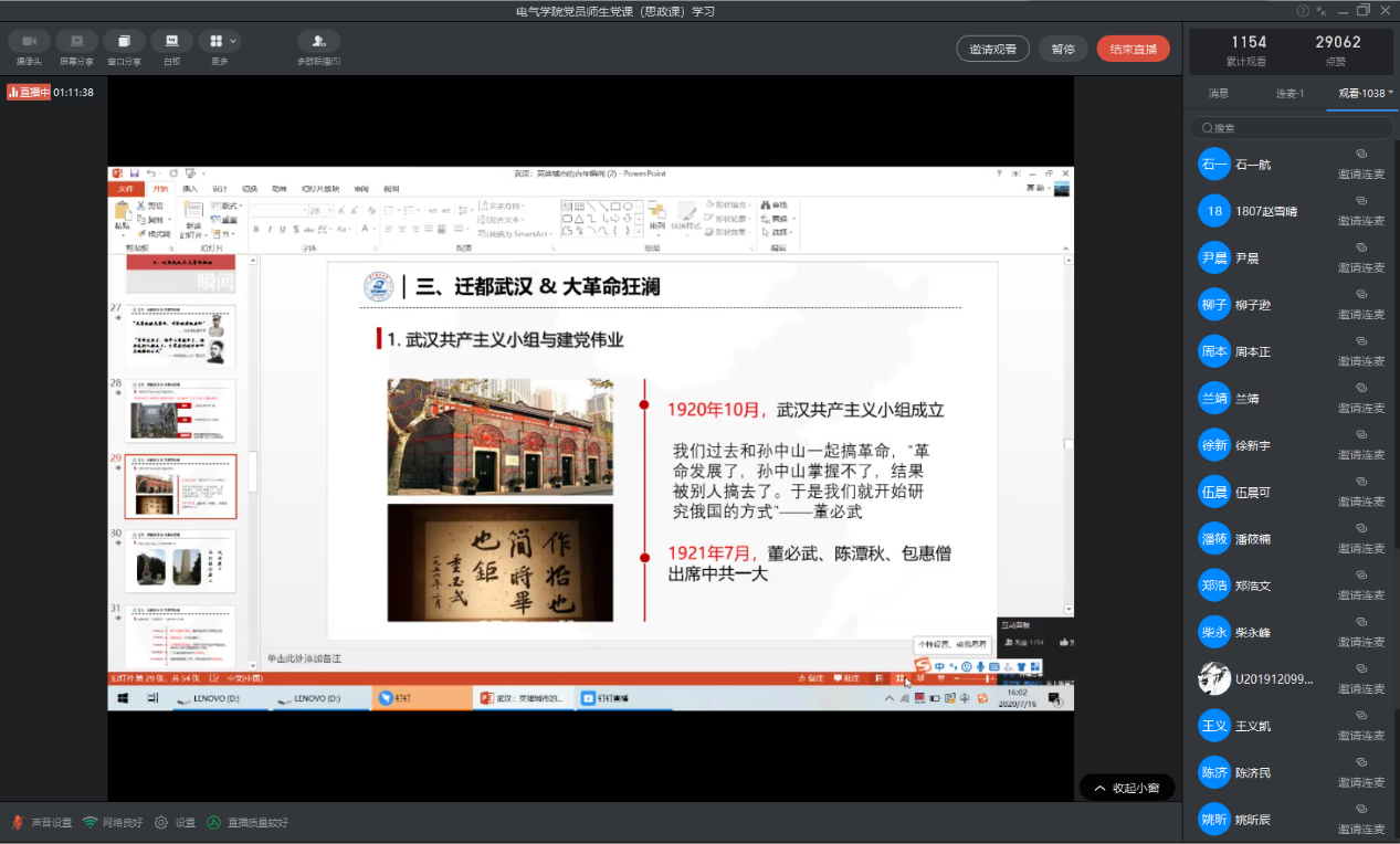 7月16日下午,NT动漫 邀请NT动漫 马克思学院教师尹平,以“武汉,一座英雄城市的百年瞬间”为主题,在线上为学院的党员师生上了一场精彩的党课和思政课,共有1200名余名师生参与了学习。