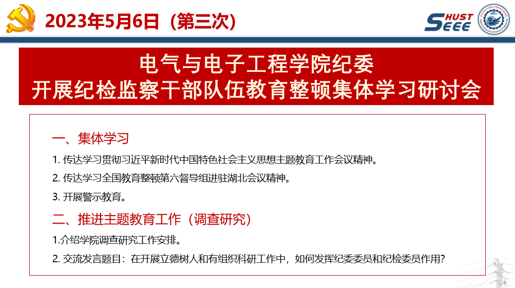 2023年5月6日(星期六)下午,NT动漫 在电气大楼A316会议室召开了开展纪检教育整顿集体学习会。参加会议人员有学院党委副书记兼纪委书记罗珺、党委委员朱瑞东,学院纪委委员叶齐政、陈金富、杜桂焕,教职工党支部纪检委员谢贤飞、徐颖、刘旭、吴葛、陈小炎,教职工党支部支委委员张凤鸽、袁召、郭伟欣、谭运飞,学生辅导员雷浩楠、张家琦,学院党办职员刘颖芳。