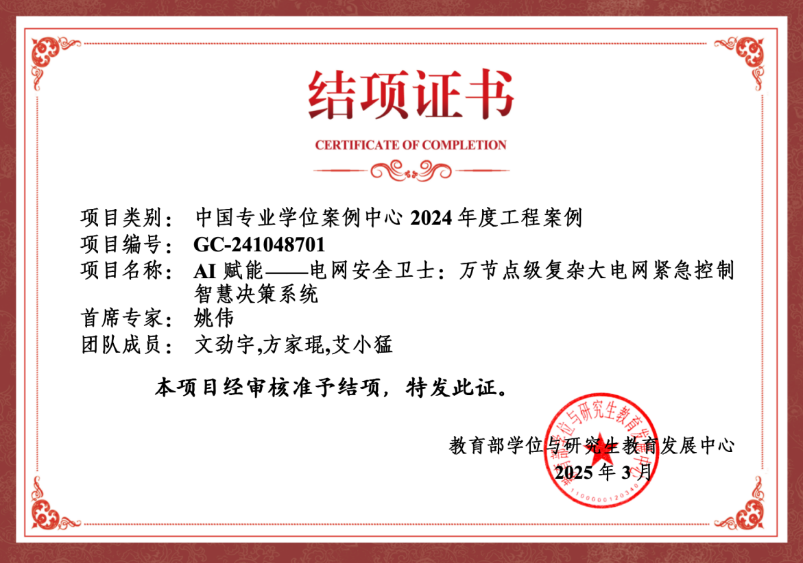姚伟主持的“万节点级电网失稳紧急控制智慧决策支持系统”获批教育部学位与研究生教育发展中心2024年度工程案例立项。案例教学是强化研究生实践能力培养的重要途径,是推动研究生培养模式改革的重要手段。姚伟表示将进一步聚焦国家重大需求,结合自身学科专业优势和工程实践,开发更多教学案例,深化工程教育产教融合改革,服务卓越工程师人才培养。