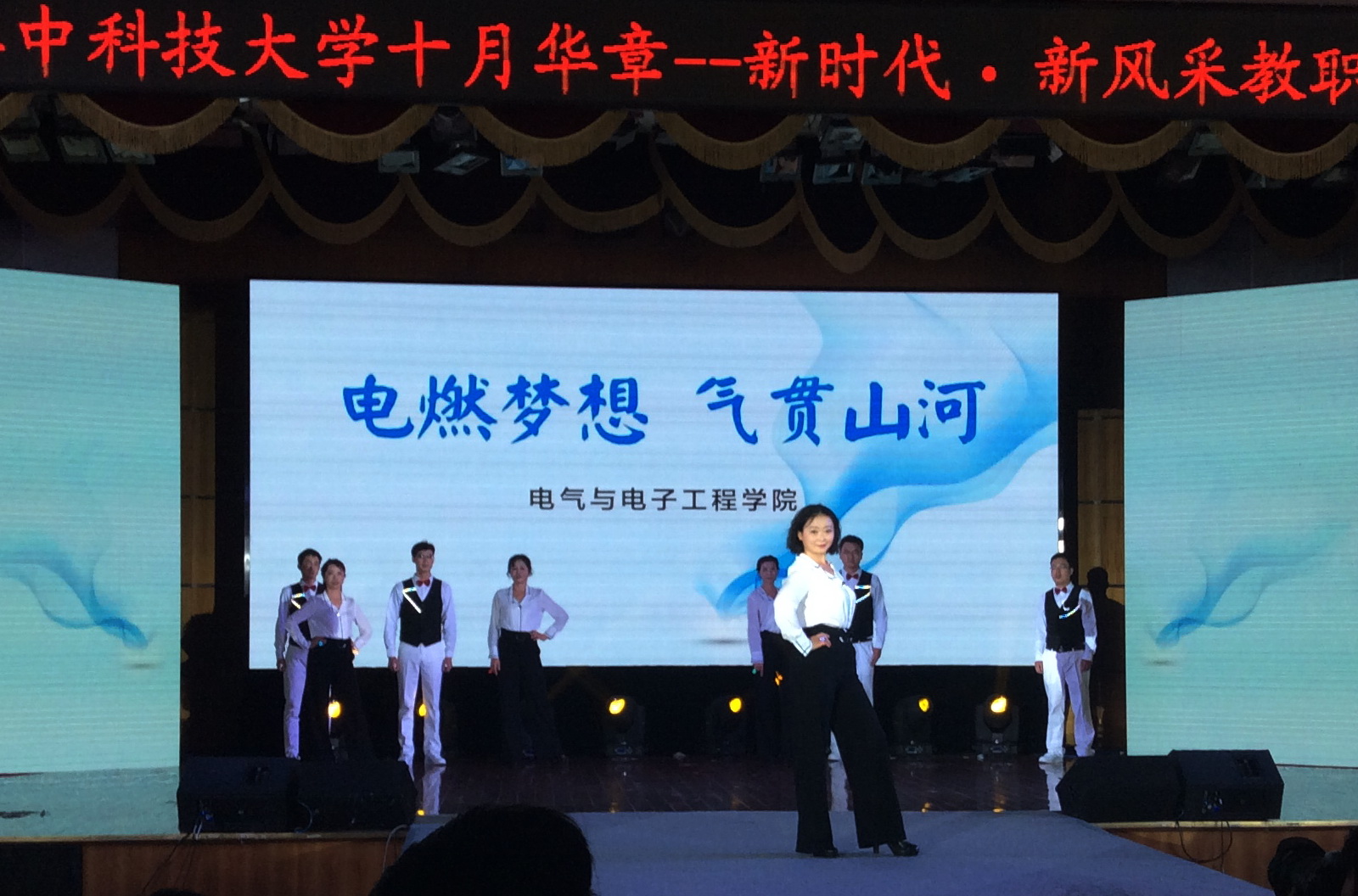 近两个月来,表演队密集训练,克服很多困难。学院工会副主席王燕和工会文体委员张凤鸽全面负责本次活动的组织工作,不仅带领大家排练,还组织挑选服装及与指导老师沟通协调。李红斌教授是多次参加了学校和学院的重要会议后直接赶来排练,演出前参加科技部组织的创新团队答辩后迅疾赶到表演现场。林桦教授多次为本科生上完课后顾不上休息,直接到场排练。电力系的青年教师周敏不仅自己每次积极参加排练,还积极帮忙找学生站队形排练。学院行政青年教师萧珺、陈灿经常积极交流排练经验,提出修改提高的好主意。教务科的朱秋华表演前脖子落枕,第二天还是坚持上场表演。学院工会委员张凤鸽、杜桂焕多次不厌其烦发出通知排练,在网上购买服装,现场筹备现场标识,帮大家预订盒饭,后勤保障做的非常好。