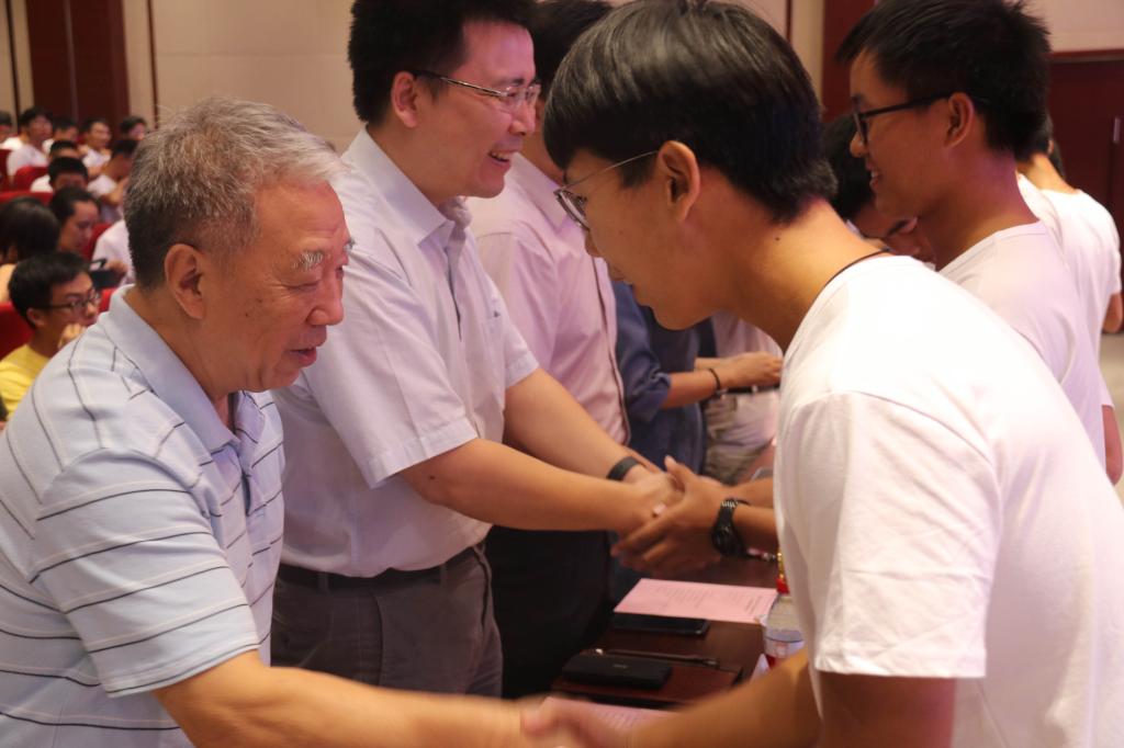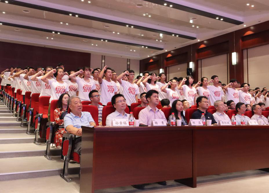 视频结束后,开学典礼正式开始。全体师生起立,奏唱国歌,激昂的乐曲声为开学典礼拉开了序幕。专属于电气学子的院徽被发放到同学们手中,学生代表上台,由特邀嘉宾为他们佩戴院徽。同时台下同学也自行佩戴上院徽。新生代表卓越1901班周尾良同学作为新生代表发言,提出了自己未来四年的规划以及与祖国同成长共进步的期望。连续三年荣获国家奖学金,已保研清大学的老生代表卓越1601班何长军,以“大学,请你勇敢些”为主题,总结了自己大学三年保持优秀的原因以及对19级新生的具体建议。教师代表应用电子系的孙伟老师表达出教师服务引导学生的真心。随后,为向祖国七十华诞献礼,各班依次起立,齐诵本班口号并奏唱献礼歌曲。歌曲完毕,全体新生进行宣誓,表达对未来四年学习生活的坚定决心。