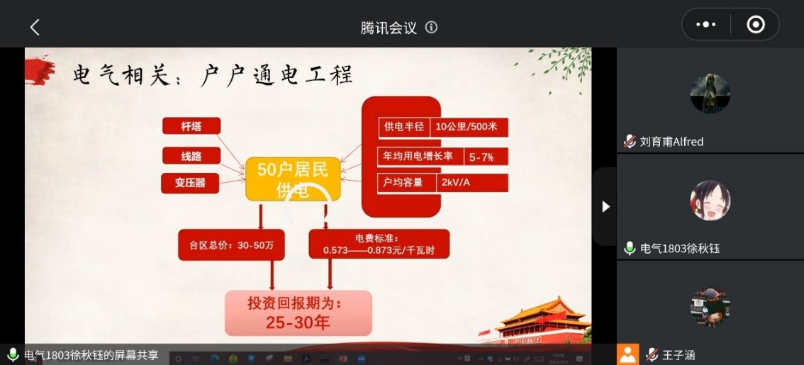 宣讲团成员结合十九届五中全会精神、十四五规划等2021年时事热点,覆盖电气专业特色,分别准备宣讲的主题和内容。1月28日,宣讲团进行线上集中备课,柳子逊和石子倩对宣讲主题和课件进行点评和指导,以期达到“精准覆盖,通俗易懂”的效果。