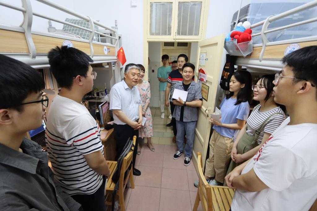 在所结对的328寝室,班级团支书、本科19级党支书付正坤同学详细介绍了班级团支部以及所负责党支部的相关情况。谈及党员的先锋模范作用,校三好学生标兵、学习委员倪谢霆同学向梁茜介绍了班级内部开展党员“一对一”帮扶等能提高班级学习成绩的制度实施情况。梁茜强调,党员同学们要在以德立班、加强荣誉班级建设的过程中发挥重要作用,要多关注班级的集体成长,多关心班上同学的身心发展状况,不让一个人掉队。