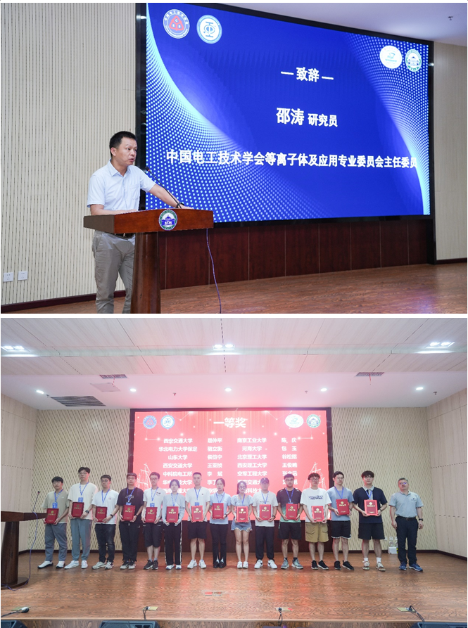竞赛颁奖仪式暨学科交叉论坛于8月14日上午在武汉大学信息学部图书馆报告厅成功举行。武汉大学电气与自动化学院副院长何怡刚教授代表承办单位致欢迎词,何院长支持所有参赛队伍在决赛的优异表现,不仅展示了出色的科技创新能力,还体现了当代大学生探索科学的热情与勇气。在科技飞速发展的时代背景下,交叉学科已成为推动科学技术突破的重要途径,希望本届学科竞赛活动能够激发更多青年学子对等离子体科学的热情,培养学生的学科交叉创新能力,加强高校和科研院所人才培养与国家需求的有效衔接,促进等离子体与环境保护、低碳能源、先进制造、高压输变电、高能物理等领域的深度融合与协同发展。
