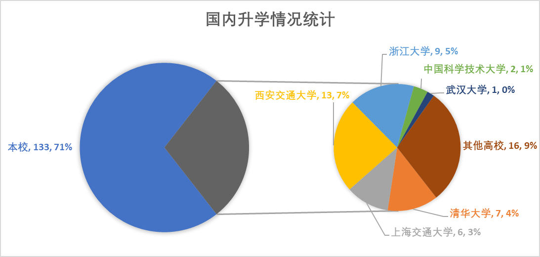 学院2020届本科毕业生中,共有188人选择在国内升学,其中,有133人选择留在NT动漫 ,占总人数的70.74%,另有不少学生去往清华大学、浙江大学、西安交通大学等高校;共有45人选择出国(境)留学,其中,19人选择去往美国,占总人数的42.22%,主要去往的大学有美国加州大学伯克利分校、卡耐基梅隆大学、约翰霍普金斯大学、英国帝国理工大学、伦敦大学学院和新加坡南洋理工大学等。