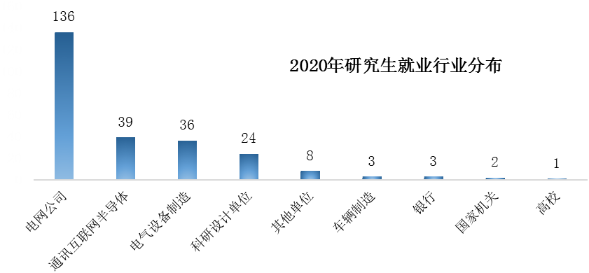 学院2020届研究生毕业生中,主要去往湖北、广东、江浙沪等地,签约就业行业以电网公司(54.0%)、通讯互联网与半导体(15.5%)、电气设备制造(14.3%)、科研设计单位(9.5%)为主。