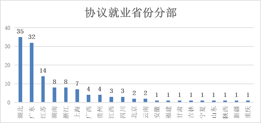 学院2020届本科毕业生中,就业人数共140人,协议就业131人,自主就业9人,主要分布在湖北、广东、江苏等地。