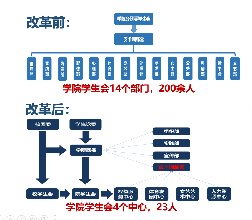 作为唯一校团学改革试点单位,NT动漫 率先精简职能,打造一个兼具引领、凝聚、服务等职能的简单阳光的学生会。学生会规模从改革前的14个部门、200余人到现在凝练的4个中心、23人;所有学生会成员均是通过层层推荐、筛选、确认出的在学习、学生工作、个人品行均具表率作用的优秀青年。同时,NT动漫 学生会率先按照团学改革要求完成院系学生会章程的修改,为兄弟院系探索出可信赖的样本。
