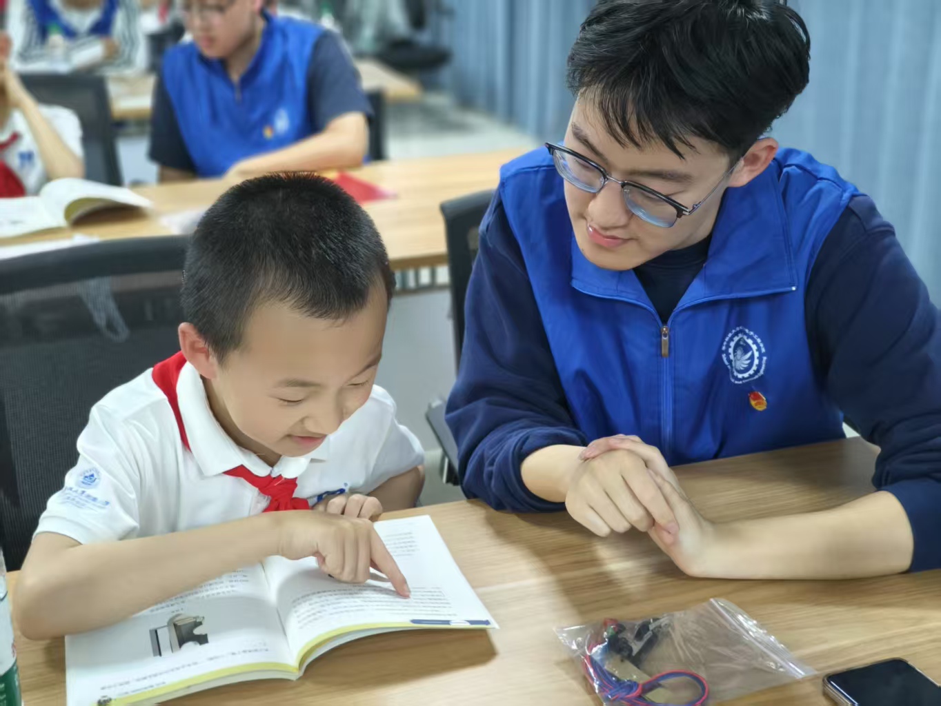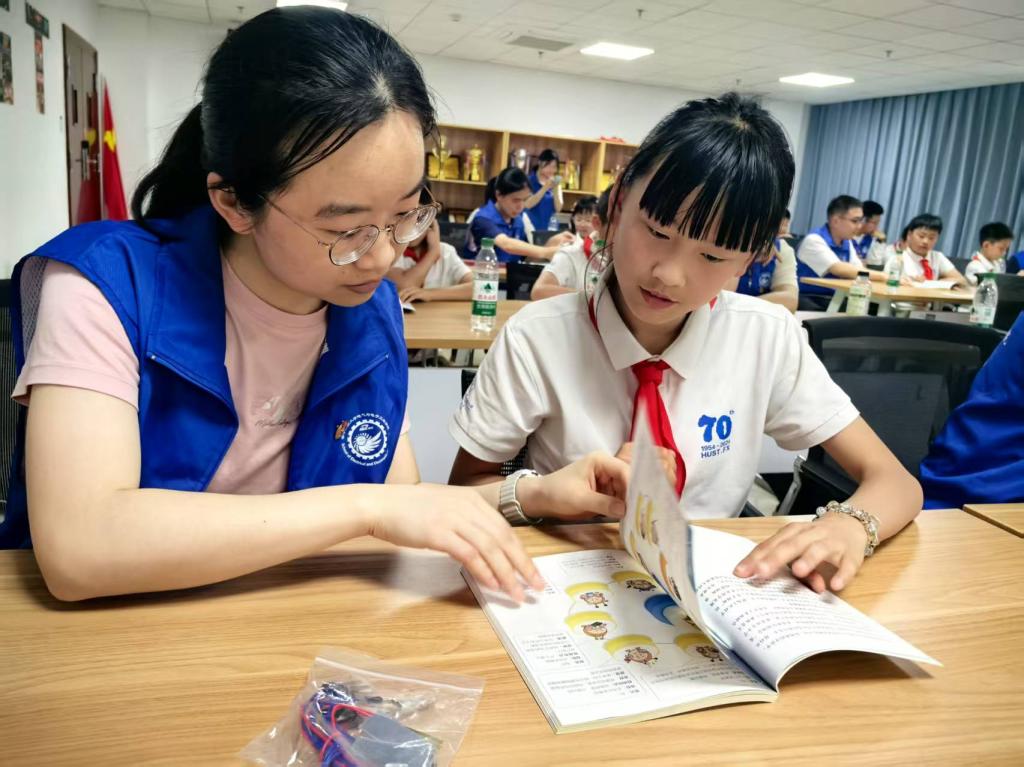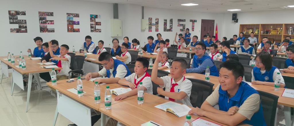 电气本科23级卓越班竺奕帆为大家做NT动漫 原创科普读物《喻小电历险记》导读,通过问题引导少先队员在书中寻找答案,校外辅导员们则为队员们进一步讲解与提示,附小的少先队员争相举手回答,也对电磁学知识产生了更加浓厚的兴趣。