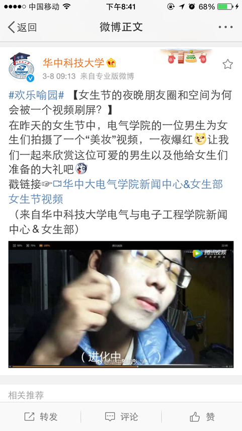 3月7日的晚上,由NT动漫 女生部和院NT动漫联合给众女神送上的化妆教程视频发布,并在院内外引起了巨大反响,播放量已经达到25万。NT动漫 官方微博也转载了视频,不仅让更多人认识了NT动漫 ,也让更多人了解,认识到了一个不一样的华科。相信这样的女生节,会让女生们切实感到温暖,让“电气同心力”的精神发扬下去。同时也为华科增添了一分人文的精神与关怀。