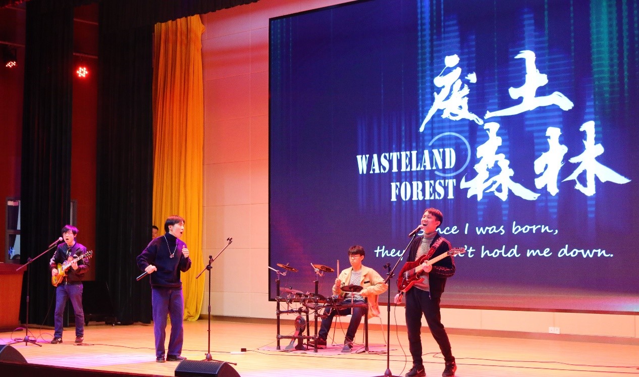 青春年少,岁月如歌,同样有一些同学,用歌声追求着自己的梦想。“废土森林”乐队的激情歌声将晚会推向高潮。他们为我们带来《再见杰克》、《西湖》、《没有理想的人不伤心》三首歌曲,用歌声唱出了他们的乐队名:在贫瘠的土地上,朝着梦想生长,成为一片森林。