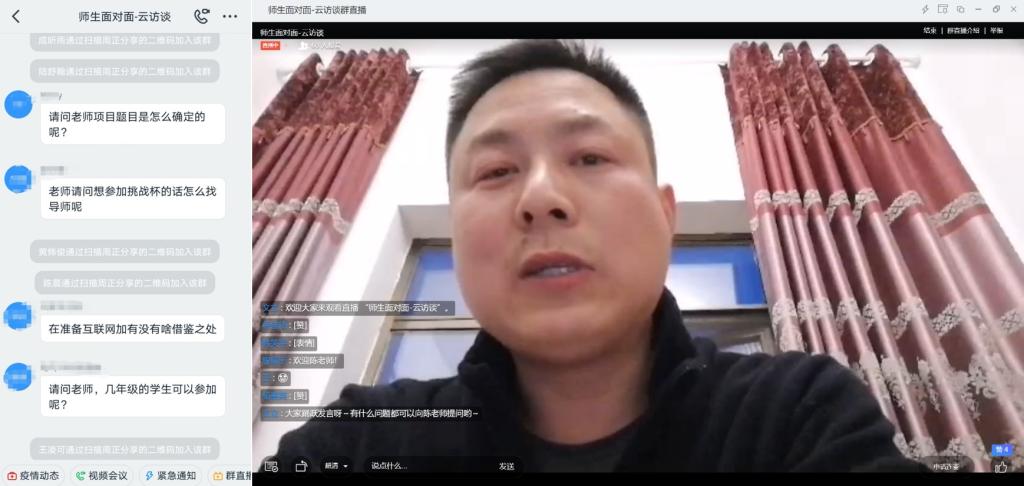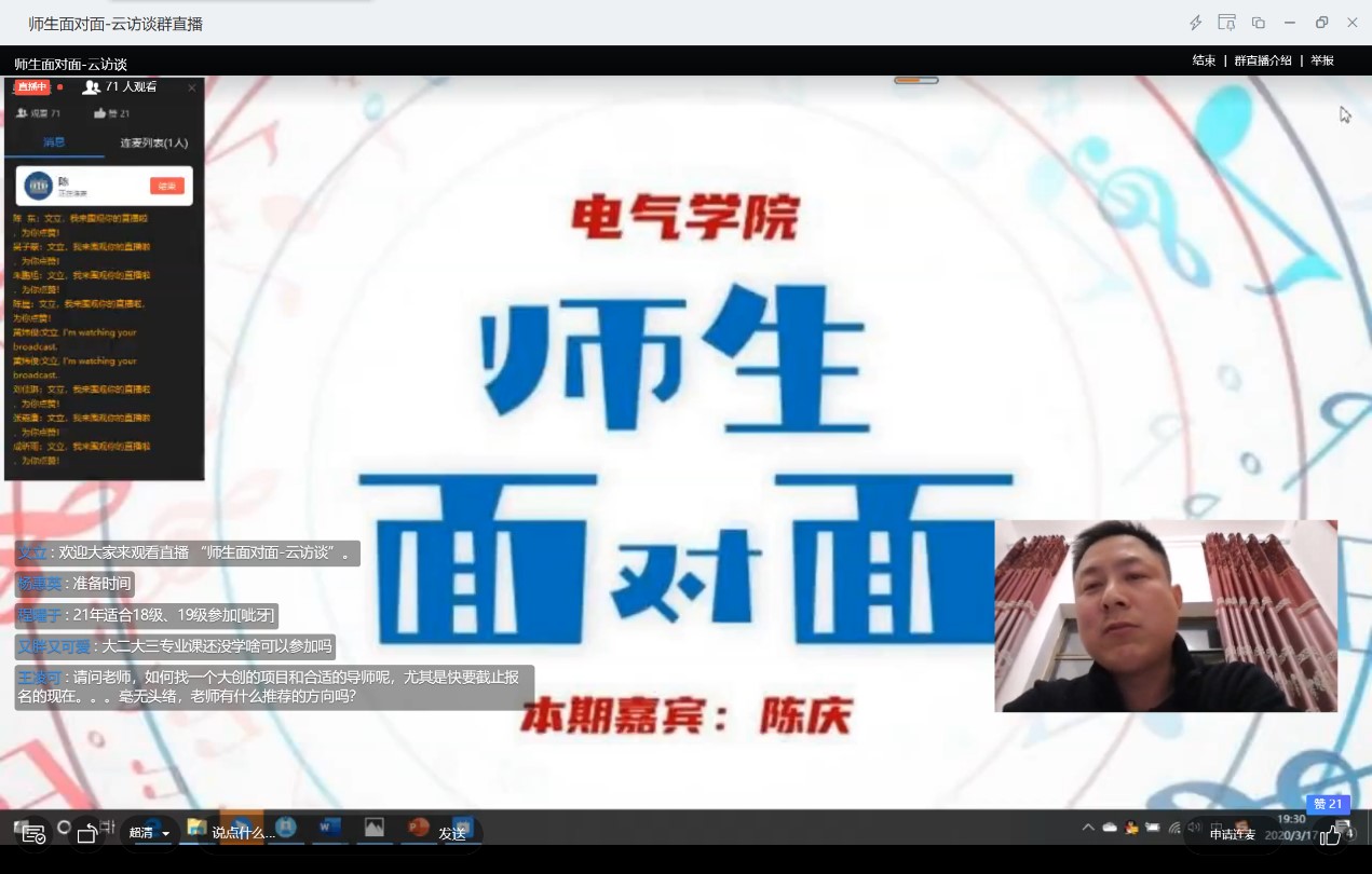 “陈庆老师已经加入了我们的直播间,让我们欢迎陈老师!”本次访谈的主持人、辅导员许文立老师说到。在NT动漫 师生面对面云访谈直播间中,同学们迎来了第一位线上嘉宾。陈庆老师是学院“慧眼识电”学生团队的指导老师,2019年,他带领团队斩获了全国“挑战杯”一等奖,取得了学院在“挑战杯”竞赛中的历史最好成绩。