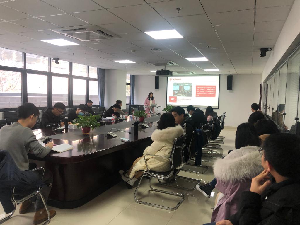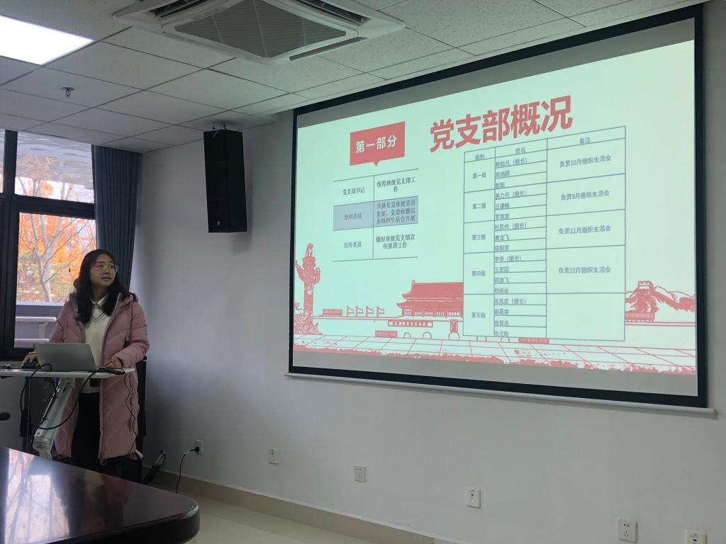 硕2004班党支部书记吴翊颖首先介绍了党支部概况。他说明了支委组成,将正式党员和积极分子分成五个小组负责各项工作。认真开展每个月的组织生活会,采用“人人讲党课”的特色支部学习模式,组织支部成员参加讲座,提高思想政治水平:支部全体成员聆听了副院长杨凯老师的《“大国重器”,聚焦建设创新型国家》思政讲座,学习国家未来的发展战略和成为创新型人才所需的科研精神。