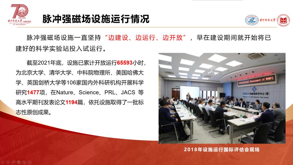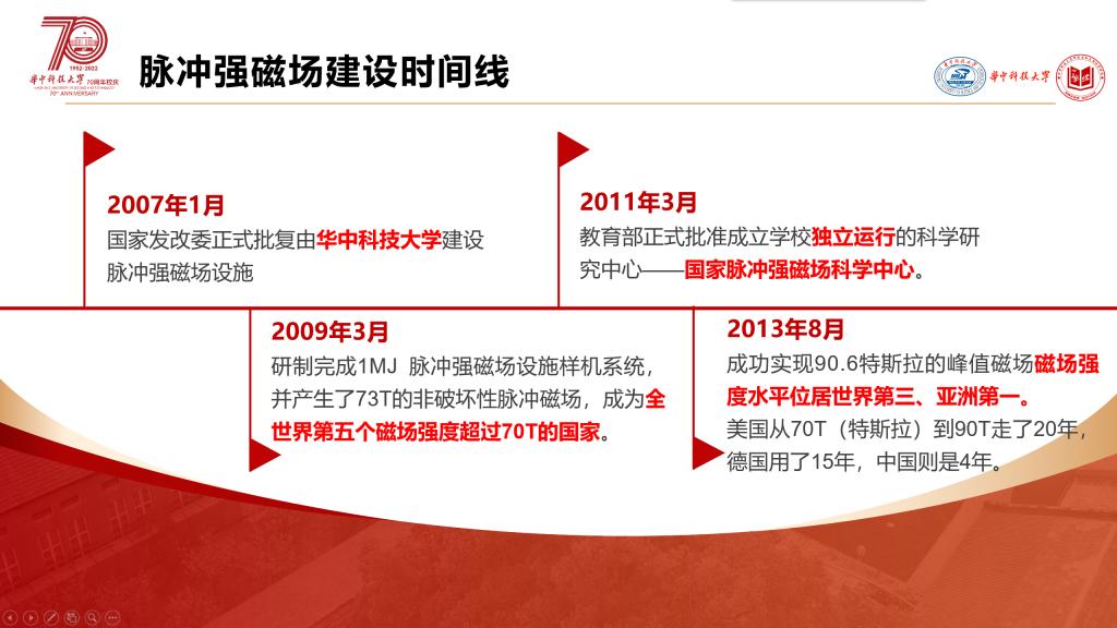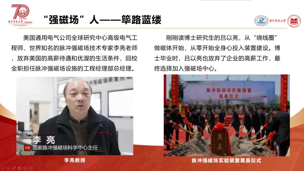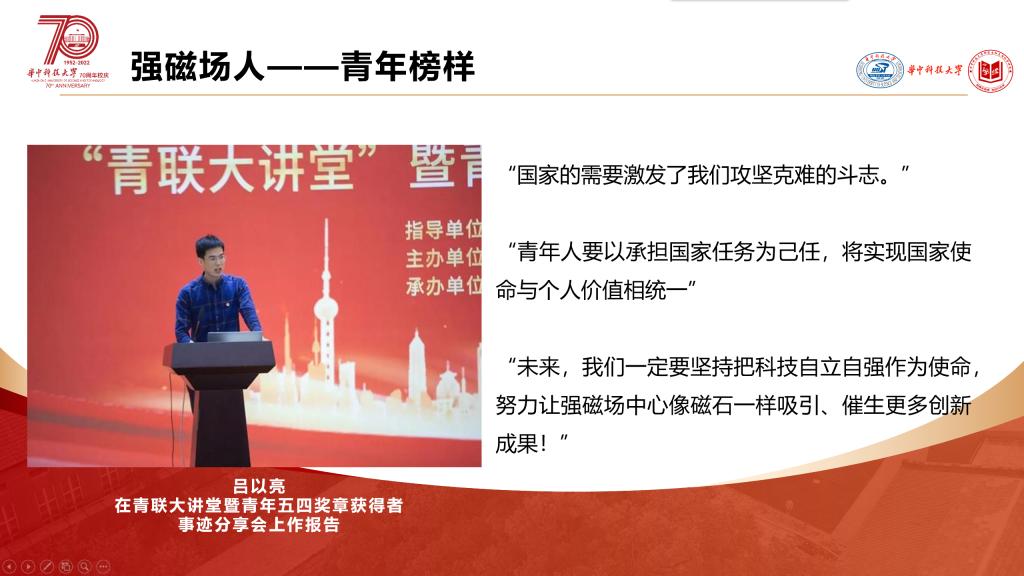 楼奕轩首先从“场”的概念出发,介绍了建设脉冲强磁场的重要科学意义。紧接着,她结合潘院院士首提建设强磁场建议(2001)、李亮教授全职回国组建团队(2007),到国家发改委正式批复建设设施(2007)、教育部正式批准成立国家脉冲强磁场科学中心(2011),再到成功实现世界第三、亚洲第一的峰值磁场强度水平(2013)、荣获国家科技进步一等奖(2019),分享了强磁场人同心奋斗、强磁场从无到有到世界领先的故事。最后,楼奕轩引用习近平总书记的讲话:“自力更生是中华民族自立于世界民族之林的奋斗基点,自主创新是我们攀登世界科技高峰的必由之路”,勉励全体同学将习近平总书记的重要嘱托转化为干事创业的行动。