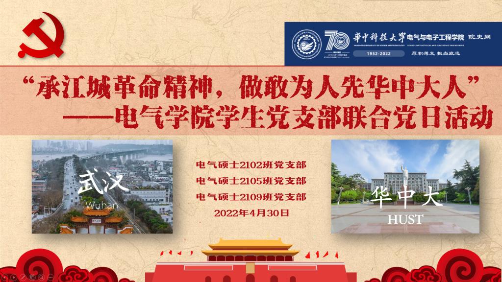 为丰富党史理论学习形式,促进党日走深、学习走实,2022年4月30日上午9点,NT动漫 硕士2102班党支部、硕士2105班党支部、硕士2109班党支部在电气大楼B203报告厅开展了“承江城革命精神,做敢为人先华中大人”联合党日活动,以“线上云参观”、“线上云打卡”形式开展主题实践,在回顾党的历史、传承红色精神的同时,坚定新时代“华中大电气人”的使命和担当,献礼华中大70周年校庆及NT动漫 70周年院庆。