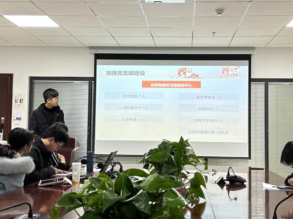 硕2101班党支部书记郑建栋介绍了党支部紧紧围绕学院党委整体部署,在院党委的正确领导下,全面贯彻落实党的二十大和二十大一中全会精神,始终以“党旗所指,青春所向”为支部建设思路,紧紧围绕党建带团建、党建促科研的支部建设目标,认真开展各项工作,严格履行党支部“三党员四群众”的主要职责,扎实筑牢党支部战斗堡垒。党支部搭建本科生一对一帮扶平台,鼓励支部党员积极投身学生组织,主动响应校庆、院庆志愿服务,积极开展社会实践活动,在实践中践行入党誓言,积极发挥党员先锋模范作用。