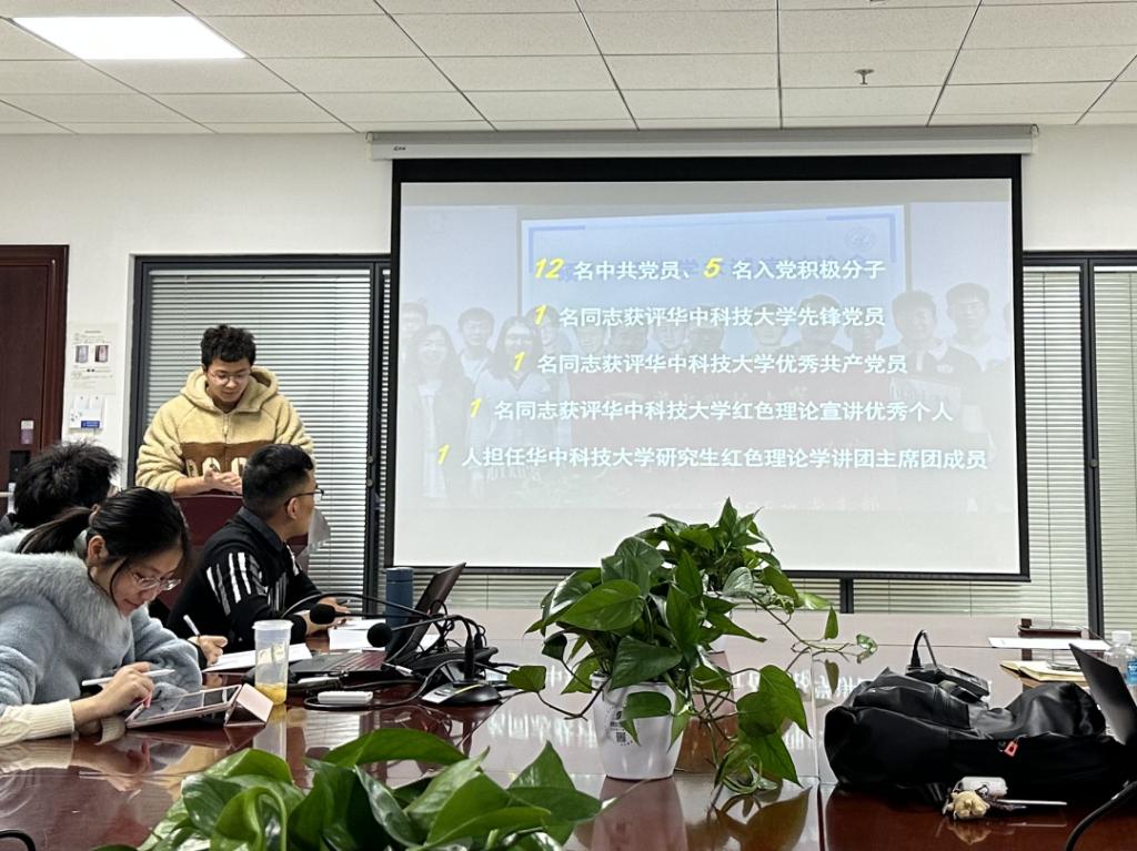 硕2202班党支部书记夏子龙介绍党支部以深入学习党的二十大精神为主线,组织开展了一系列党建相关活动,顺利完成了从建立到发展、从生疏到磨合、从不会学到带头学的全过程。党支部坚持政治引领、夯实理论基础,按时按量组织三会一课工作,定期召开党员大会、支委会、党小组会;党支部把稳意识形态,理论武装思想,支部成员紧密联系工作实际,扎实开展批评与自我批评,深入剖析思想上、作风上存在的突出问题。