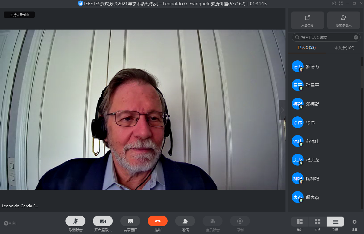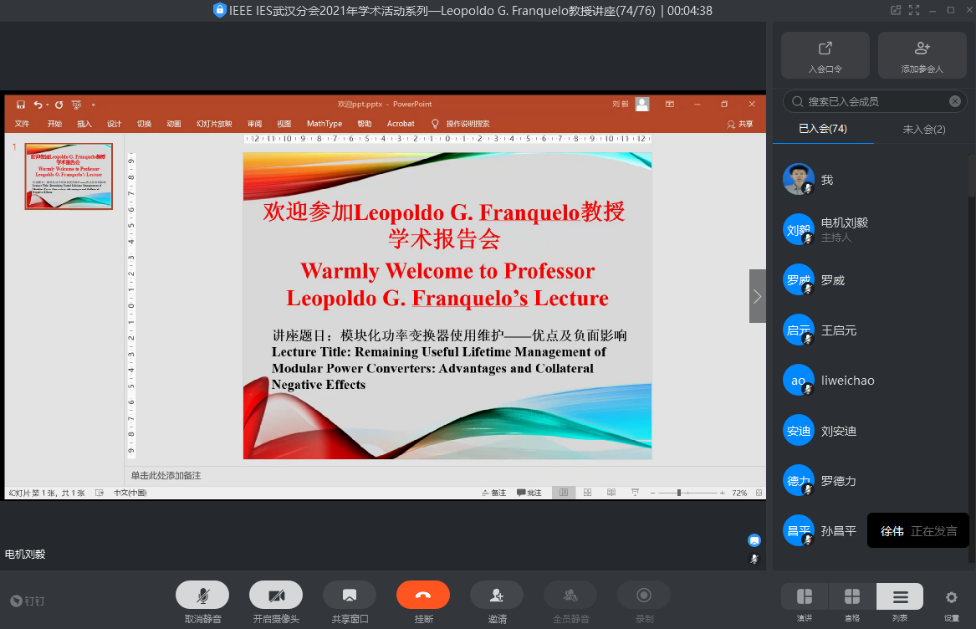 受IEEE工业电子学会(IES)武汉分会和NT动漫 的邀请,IEEE Life Fellow、IEEE IES学会 卸任主席、IEEE TIE卸任主编、IEEE OJIES创始主编Leopoldo G. Franquelo教授于3月25日做客“携手电气精英,与未来同行”系列讲座第412期暨IEEE IES武汉分会2021年学术活动系IEEE IES 杰出讲师讲座(Distinguish Lecture),通过钉钉会议平台在线作了一场精彩的学术报告“模块化功率变换器使用维护——优点及负面影响”。