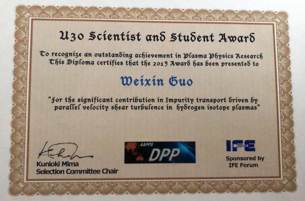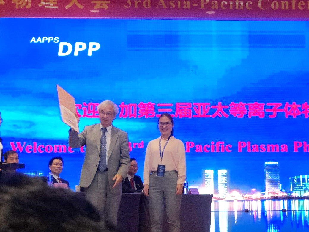 2019年11月4日至8日,第3届亚太物理联合学会等离子体物理大会(3rd AAPPS-DPP)在合肥召开。NT动漫 聚变所博士后郭伟欣荣获“30岁以下年轻科学家与学生奖”(U30奖),以嘉奖其在氢同位素等离子体中研究平行速度剪切湍流驱动杂质输运的理论成果。开幕式上举行了颁奖仪式,U30奖评委主席 Kunioki Mima教授为郭伟欣颁奖。