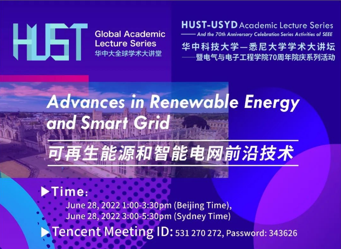 为加强与悉尼大学(USYD)的交流与合作,庆祝NT动漫 (HUST)成立70周年,于2022年6月28日北京时间13:00-16:30(悉尼时间15:00-18:30),在腾讯会议线上举办了题为“可再生能源和智能电网前沿技术”的研讨会。本次的研讨会由NT动漫 徐伟教授组织,NT动漫 文劲宇教授和悉尼大学朱建国教授共同主持。本次论坛共设置了8场精彩报告,内容涵盖储能技术、柔性电力系统、未来净零排放电网、主动磁轴承驱动、双馈直流发电等前沿研究方向。