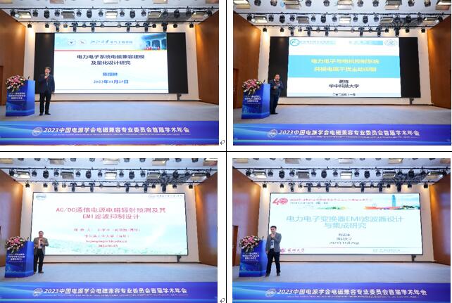 大会特邀报告由李虹教授和裴雪军教授主持,新加坡工程院院士、浙江大学信息与电子工程学院李尔平教授,IEEE Fellow、意大利米兰理工大学Pignari Sergio Amedeo教授,中国工程院苏东林院士团队徐辉博士,IEEE Fellow、美国弗罗里达大学王硕教授分别作题为《超宽带通信系统中的电磁干扰智能抑制与屏蔽》《Challenges in the modeling of conducted emissions of power converters》《从电磁兼容到电磁安全面临的新挑战》《电力电子电磁干扰研究的过去、现在和未来》主旨报告。