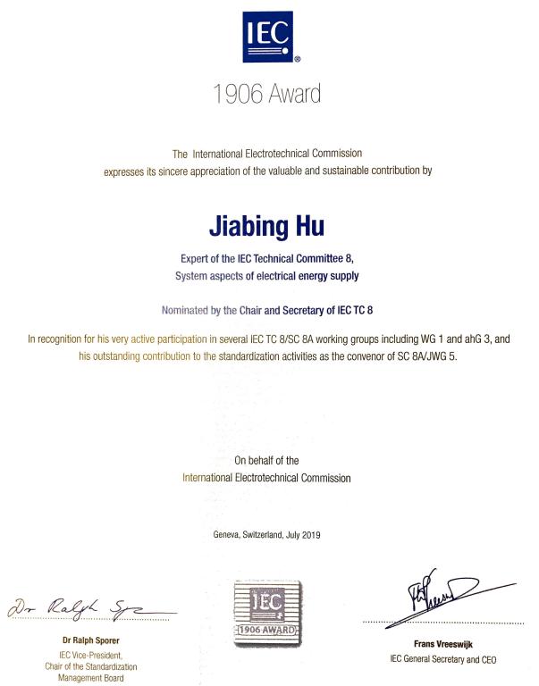 因在国际电工委员会(International Electrotechnical Commission, IEC)技术委员会SC8A(可再生能源并网)国际标准制定工作中的杰出贡献,NT动漫 胡家兵教授荣获2019年度“IEC 1906奖”。
